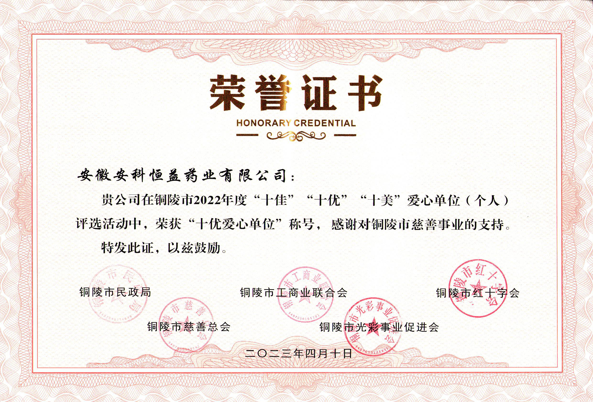 近日,我公司收到銅陵市“十優(yōu)愛心單位”稱號榮譽證書。